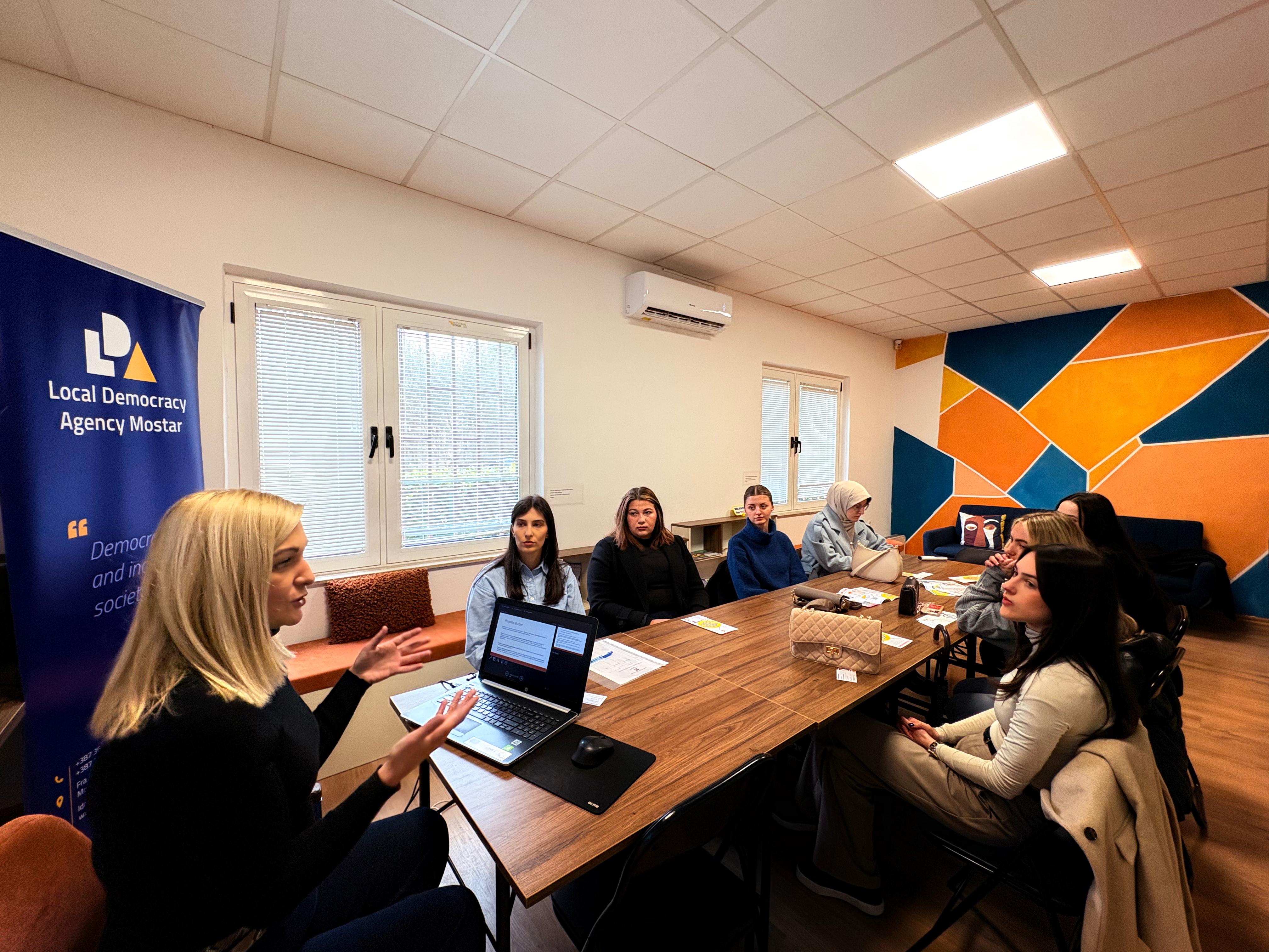 Agencija lokalne demokratije (LDA) Mostar je u petak, 27. marta 2026. godine, organizovala edukativni susret i praktičnu prezentaciju za studente Ekonomskog fakulteta i univerzitetskog studija Dizajn interijera Univerziteta „Džemal Bijedić“ u Mostaru. Aktivnost je realizovana u saradnji s asistenticom Tajmom Taso Fejzić, u okviru redovne nastave iz predmeta projektni menadžment, a s ciljem povezivanja teoretskog znanja s praktičnim iskustvima iz oblasti projektnog budžetiranja.