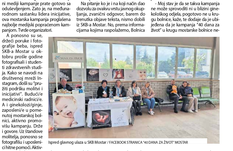 Prije skoro godinu, glavni ulaz u Sveučilišnu kliničku bolnicu Mostar okupirali su štandovi ispunjeni fotografijama beba, porukama koje pozivaju na život, a put do ulaznih vrata ispunjen je ljudima koji bdiju i mole. Mole za život, za porodicu. Barem tako tvrde. Prvi ciklus, kampanja inicijative “40 dana za život”, u Mostaru je startao u martu prošle godine. Uslijedila su svakodnevna okupljanja, cjelodnevne molitve srijedom, mise, a potom i nova jesenja kampanja. 18. februara ponovo slijedi proljetna.