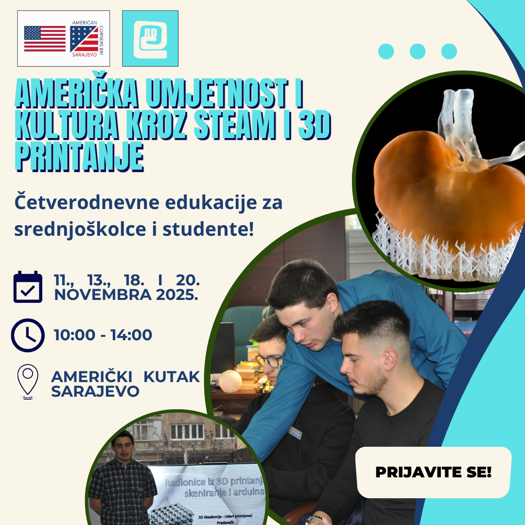 Pridruži se radionici Celebrating American Arts and Culture through STEAM i otkrij spoj kreativnosti, tehnologije i inovacije! Tokom radionice učesnici će učiti o američkoj umjetnosti, muzici, arhitekturi i kulturi, te kreirati vlastite 3D modele inspirisane legendarnim ličnostima i znamenitostima.