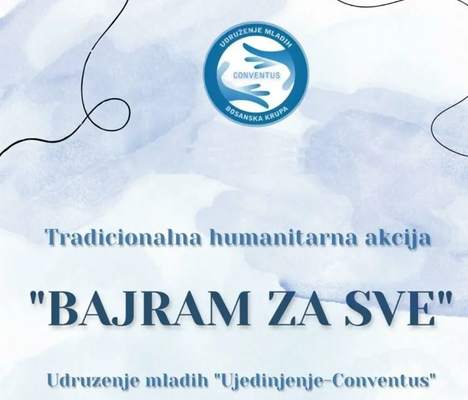 Udruženje mladih “Ujedinjenje-Conventus” Bosanska Krupa organizuje tradicionalnu Humanitarnu akciju “Bajram za sve”. Ovogodišnja Humanitarna akcija će se realizovati u periodu od 16.03.2026. do 18.03.2026. Period od 16.03.2026. do 18.03.2026. uključuje prikupljanje osnovnih životnih namirnica i higijenskih potrepština u tržnim centrima Bingo na lokaciji Pilana i kod autobuske stanice, te Balkić Impex, gdje će se nalaziti volonteri. U četvrtak, 19.03.2026. godine, slijedi podjela humanitarnih paketa socijalno ugroženim porodicama na teritoriji Grada Bosanska Krupa. Na ovaj način bosanskokrupsko Udruženje mladih “Ujedinjenje-Conventus” tradicionalno, već dugi niz godina, uljepšava nadolazeće praznike našim sugrađanima, koji su socijalno ugroženi.
