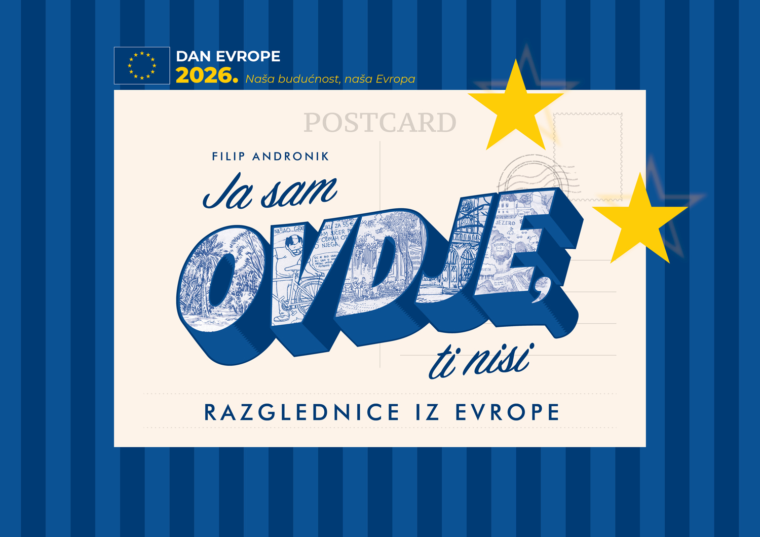 Povodom Dana Evrope, pozivamo vas na izložbu „Ovdje sam, ti nisi – Razglednice iz Evrope“, umjetnički projekat Filipa Andronika koji Evropu prikazuje kroz lične trenutke, putovanja i susrete.