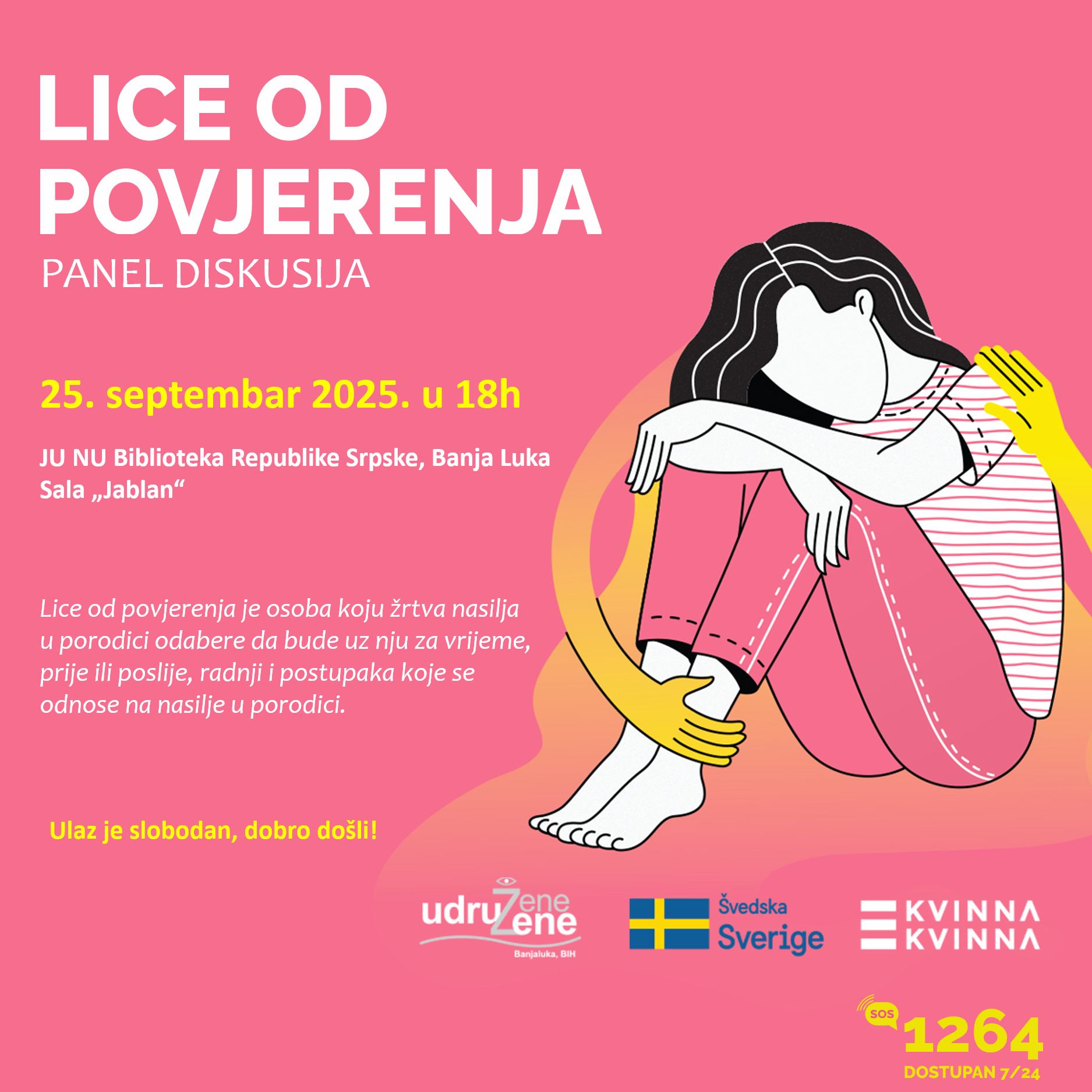 Pozivamo vas na panel o institutu Lica od povjerenja koje je propisano Zakonom o zaštiti od nasilja u porodici Republike Srpske, a u kom će govoriti pravna i psihološka savjetnica Fondacije Udružene žene, kao i korisnica naših servisa podrške i zaštite.