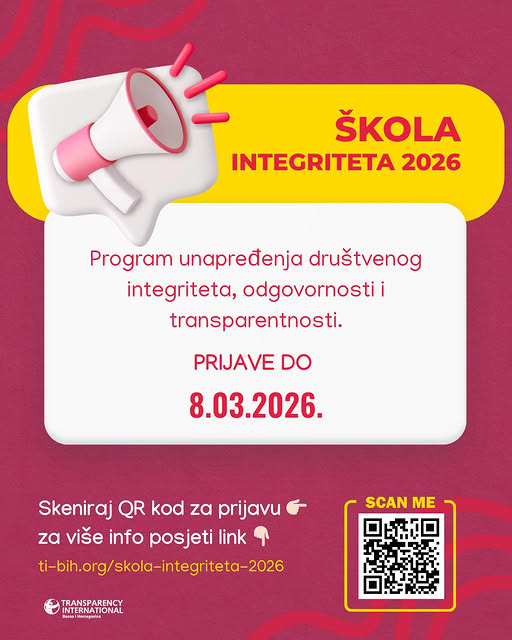 TI BiH Škola imntegirteta je prilika za aktiviste organizacija civilnog društva, novinare, aktiviste političkih partija, uposlenike javnog i privatnog sektora, studente završnih godina dodiplomskih ili poslije-diplomskih studija da od vodećih stručnjaka nauče kako graditi društvo zasnovano na etici, transparentnosti i odgovornosti.