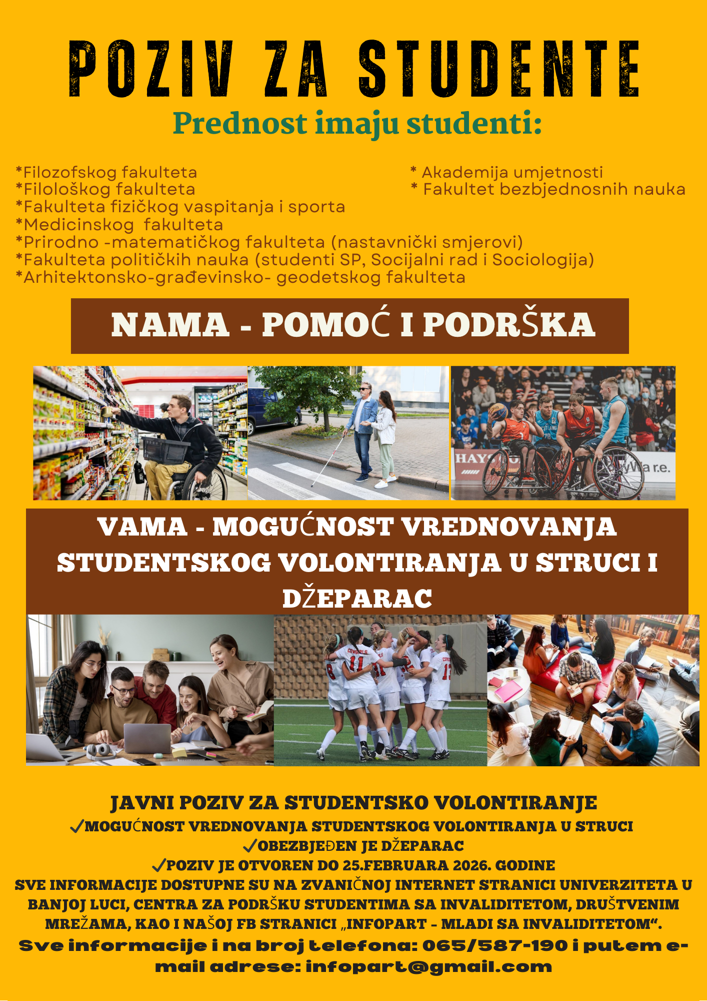 Javni poziv se raspisuje u okviru projekta „Danas za sutra, mladi za budućnost“ kojeg finansira Informativni centar za osobe sa invaliditetom „Lotos“ Tuzla uz podršku Evropske Unije. Projekat se sprovodi u periodu oktobar 2025 – maj 2026. godine, s ciljem unapređenja položaja studenata i mladih sa invaliditetom u Gradu Banja Luka.